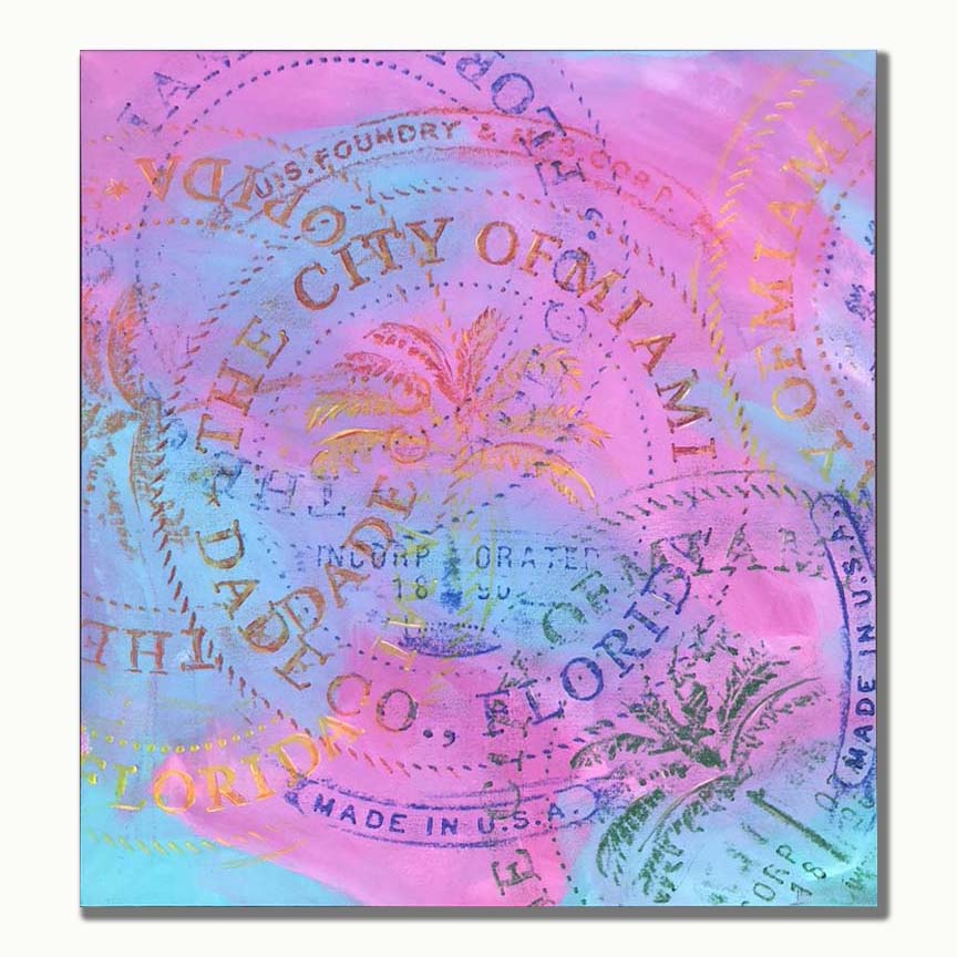 "The series “City Inspired” originated short before the pandemic reached the U.S. The main subject of this series is the artwork found on the manholes of the city of Miami transferred on to canvas or paper using the rubbing technique usually against a colorful and abstract background. In the latest pieces of this series, I’ve included backgrounds representing the maps of Florida and the world indicating our inevitable connectivity, especially amidst the pandemic. The city of Miami “stamped” all over the maps indicates how whatever each one of us does in our small or large city can affect the residents of the state, of the country and even of the world. "
